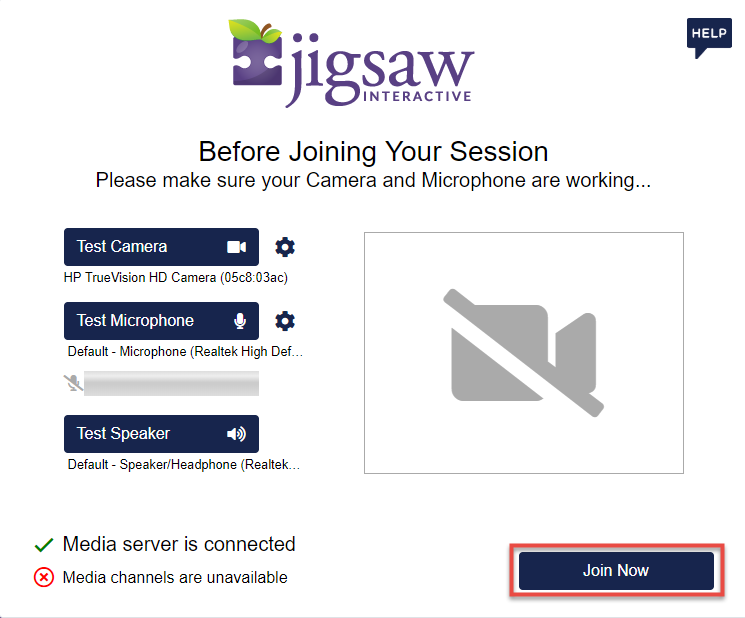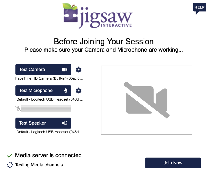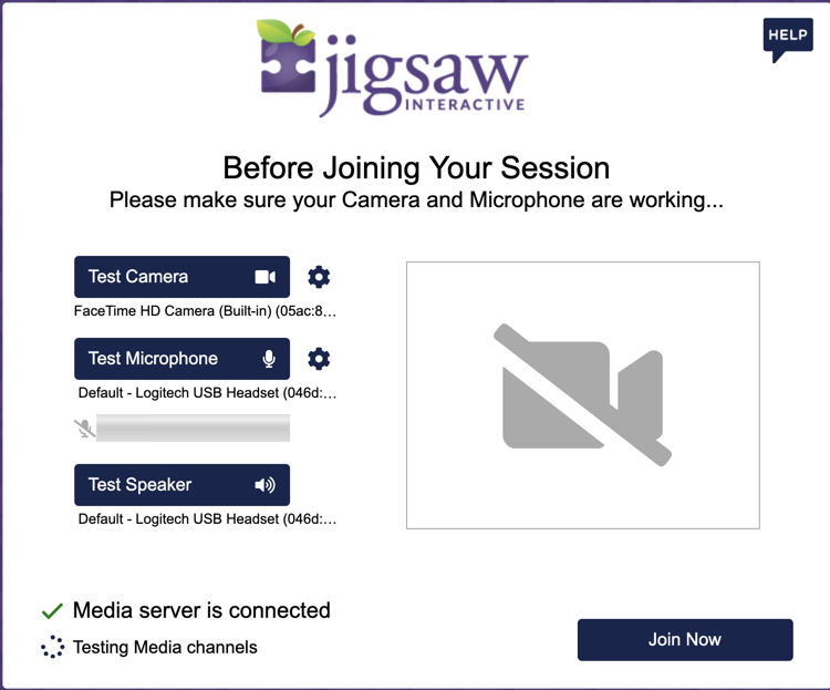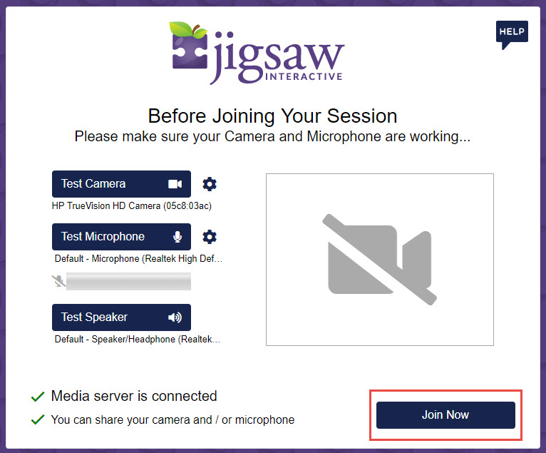 3. Jigsaw gives you the opportunity to test your Camera, Microphone, and Speaker before joining. Once you are ready, click Join Now.