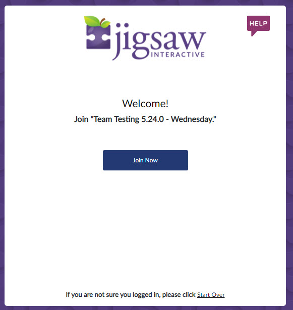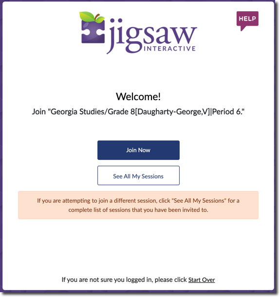 If you click a link to join a session and it does not ask for your email address, this means you (or someone else) is already logged into Jigsaw. If you are unsure the login belongs to you, click the 'Start Over' that appears in the message 'If you are not sure you logged in, please click Start Over' to return to the login screen. This will log the account out of Jigsaw. You can then click the link again, or log in and select the session from the My Sessions page to join.
