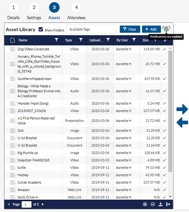 You can easily add assets to your session during the creation process. During Step 3 of creating a session, you can move assets from the library to your session.