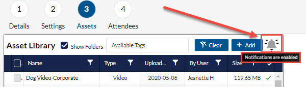 Notifications can be enabled for the Asset Library. Located in the upper right corner of the Asset Library, the gray bell can be clicked to enable or disable notifications. This is the first step in turning on the Window notifications shown in Step 9 under Asset.