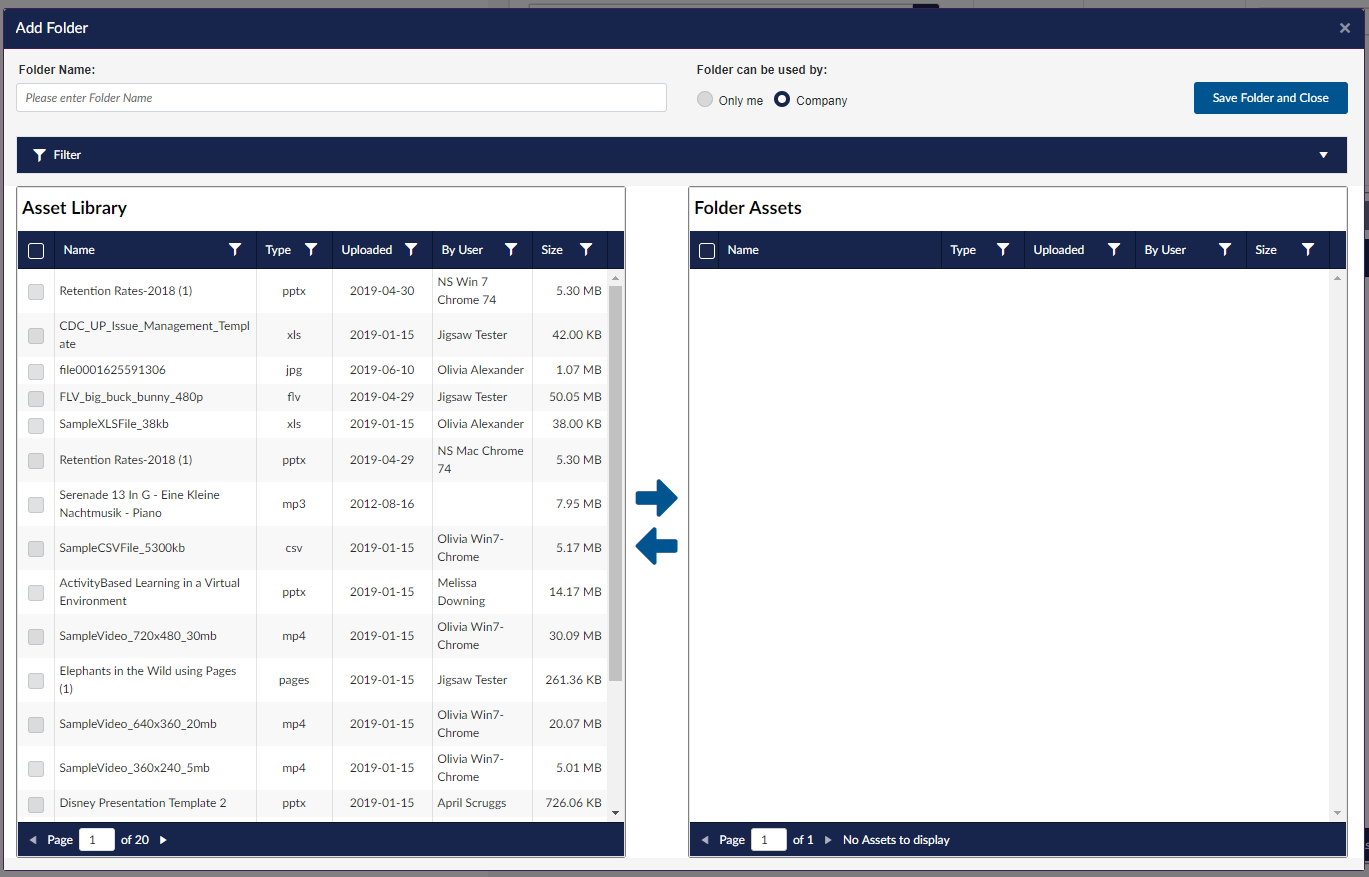 This screen will allow you to add a new folder to the Asset Library and then add assets to that folder.