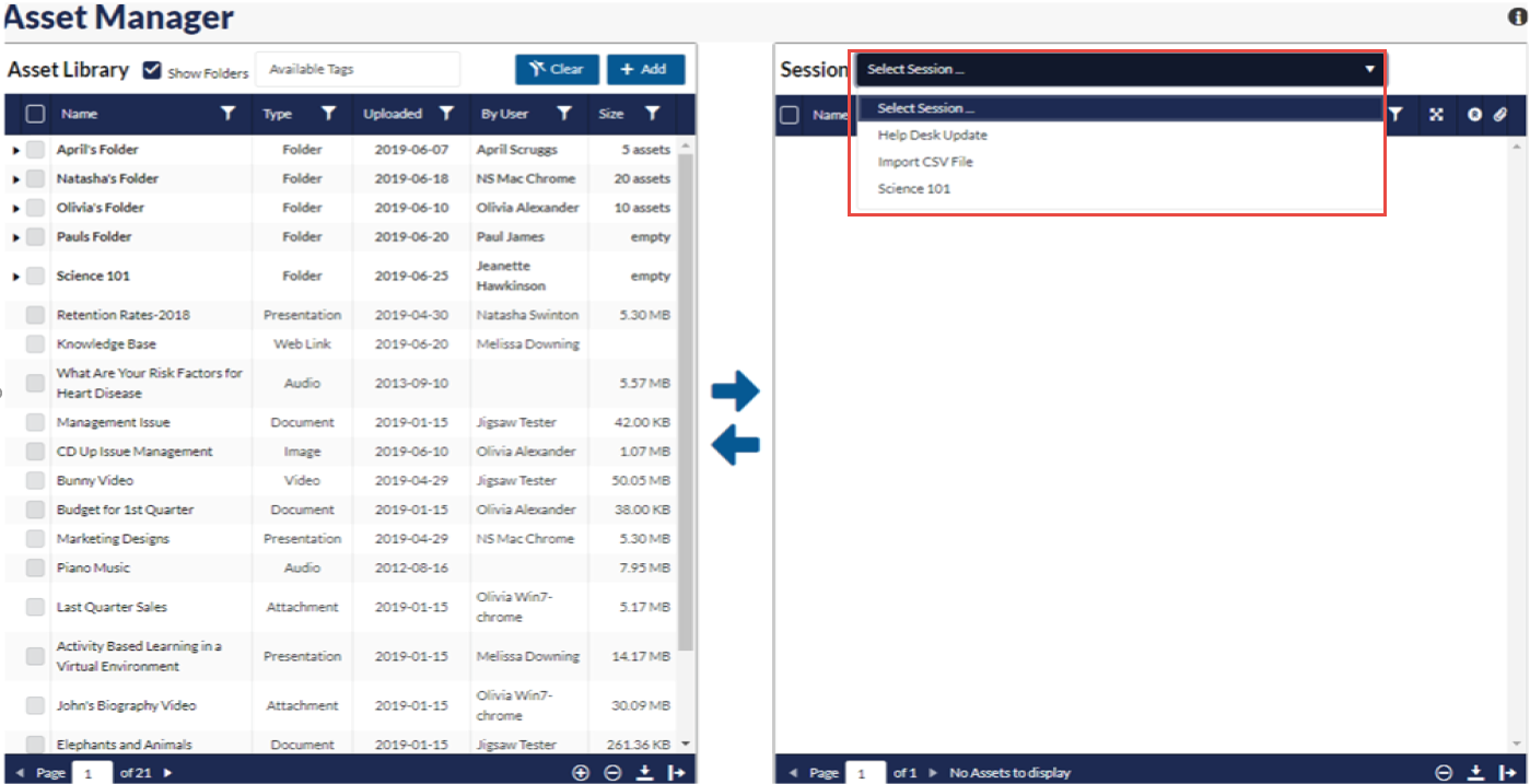 The Asset Manager is almost identical to the Asset Library that is available when creating a session. The only difference is that in the Asset Manager, you need to select your session if you are going to add any assets to a specific session.