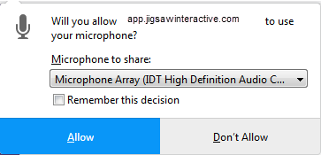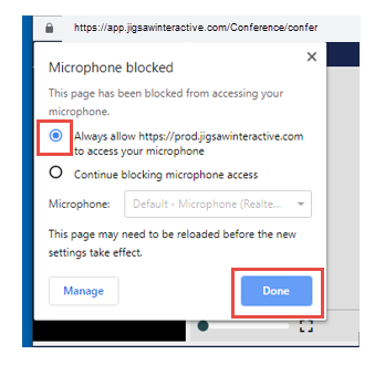 3. A message box will appear informing you that your microphone is blocked and requesting that the current page (Jigsaw) access. Click Always allow then click Done.