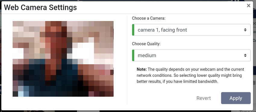 Clicking this option opens a pop-over that allows you to change your web cam settings during the session
