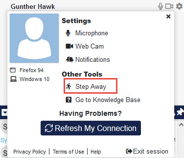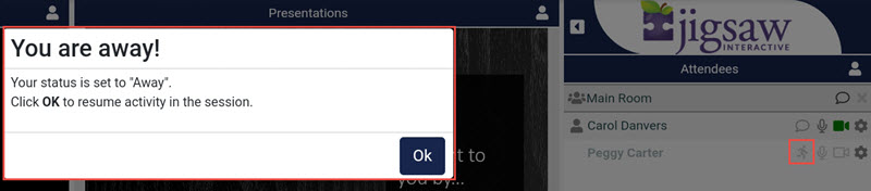 Allows you to step away from a session by setting your status to Away, while all other attendees see your status as Away.