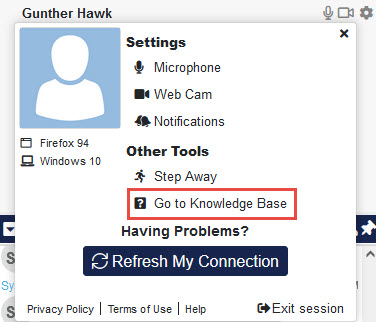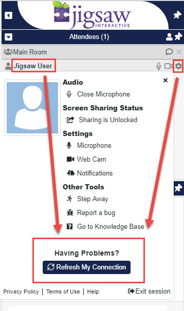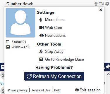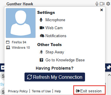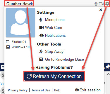Refreshes your connection. Use this if you have web cam or audio issues, or if you see a frozen screen share or presentation pane.