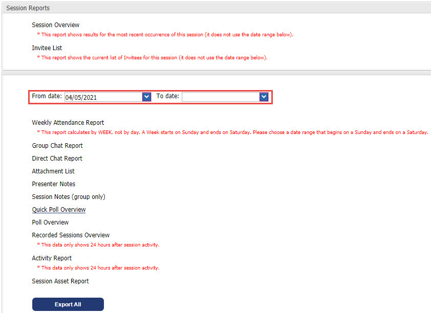 Enter the date range to filter for reports within a specified date. Click on each report to view the individual report in your browser. For Session Overview and Invitee List, the date range is not needed.