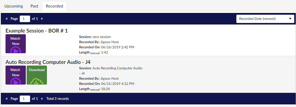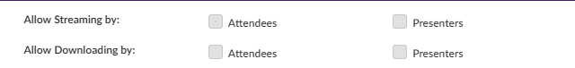Allow Streaming By and Allow Download By give attendees and presenters access to the Watch Now and Download buttons in their Jigsaw Recorded Sessions tab.