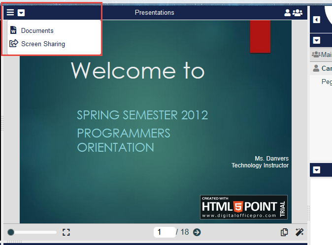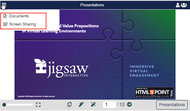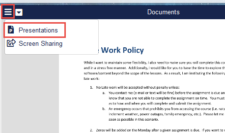 Please Note: If you are displaying Presentations, only Documents and Screen Sharing will appear in the Menu. If you are displaying Documents, only Presentations and Screen Sharing will appear.