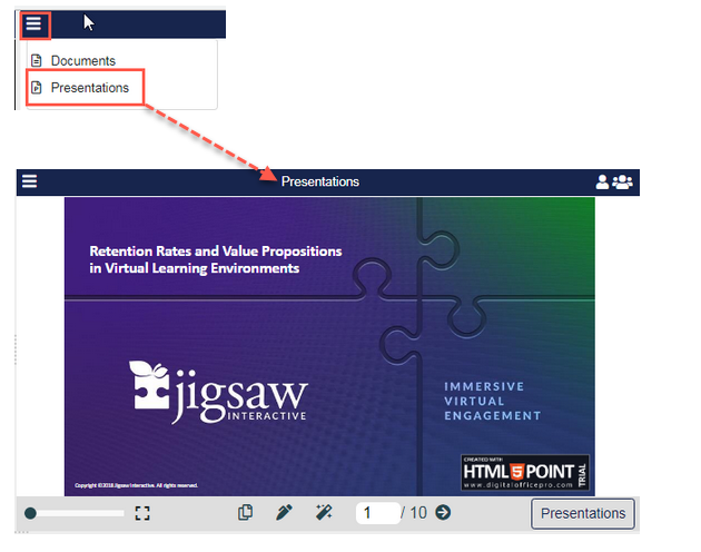 If Presentations do not appear under Pane 2 menu icon, or to change Presentations, click the Down Arrow next to the menu icon and select Go to Presentations.