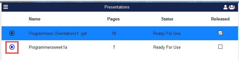 Click the Play button next to the Presentation to display.