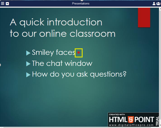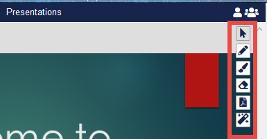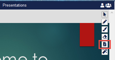 To use the laser pointer on a Presentation, click the Laser Pointer icon in the bottom right of Pane 2 when the presentation is open.