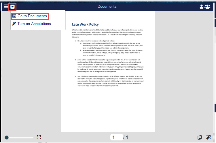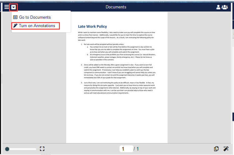 Click the Documents menu (down arrow) and select Turn on Annotations to enable annotations.
