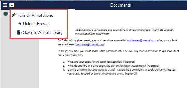 The Host or Co-Host can also save annotated documents to their Asset Library. Click on the down arrow for Documents and select Save To Asset Library.