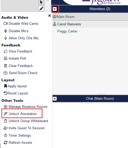 To do this for all attendees, click the Global Attendee Options icon in the Attendee list and select Unlock Annotation.