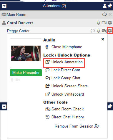 To do this for individual attendees, click the Settings icon by their name and select Unlock Annotation.