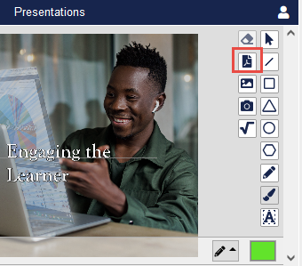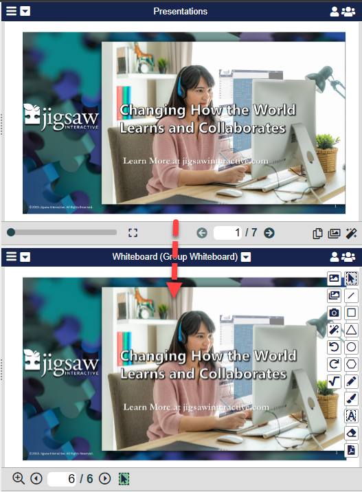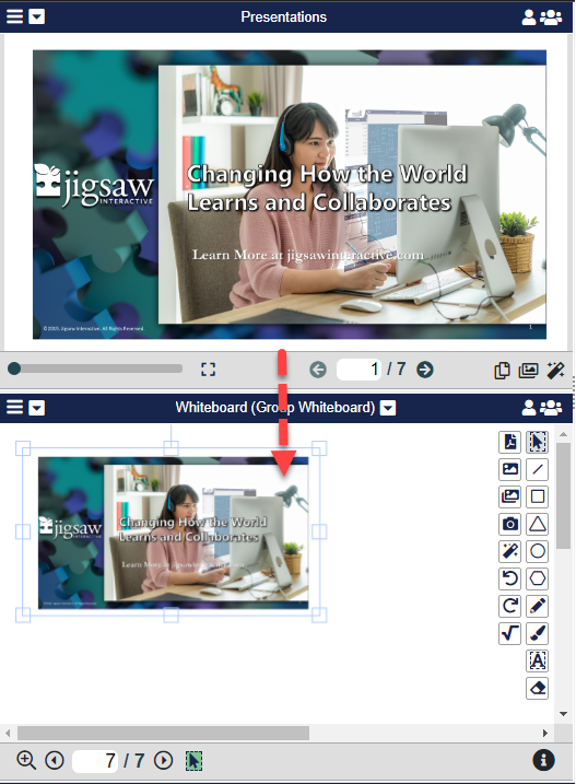 When working with Presentations, the Host or Co-Host can copy a screen from the presentation to the Whiteboard as an image. This will allow attendees more options to collaborate.