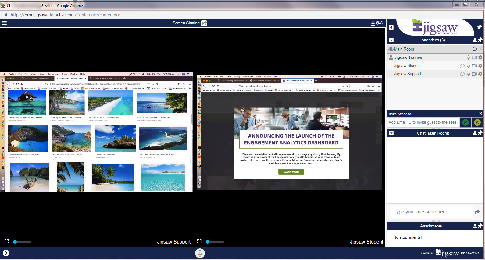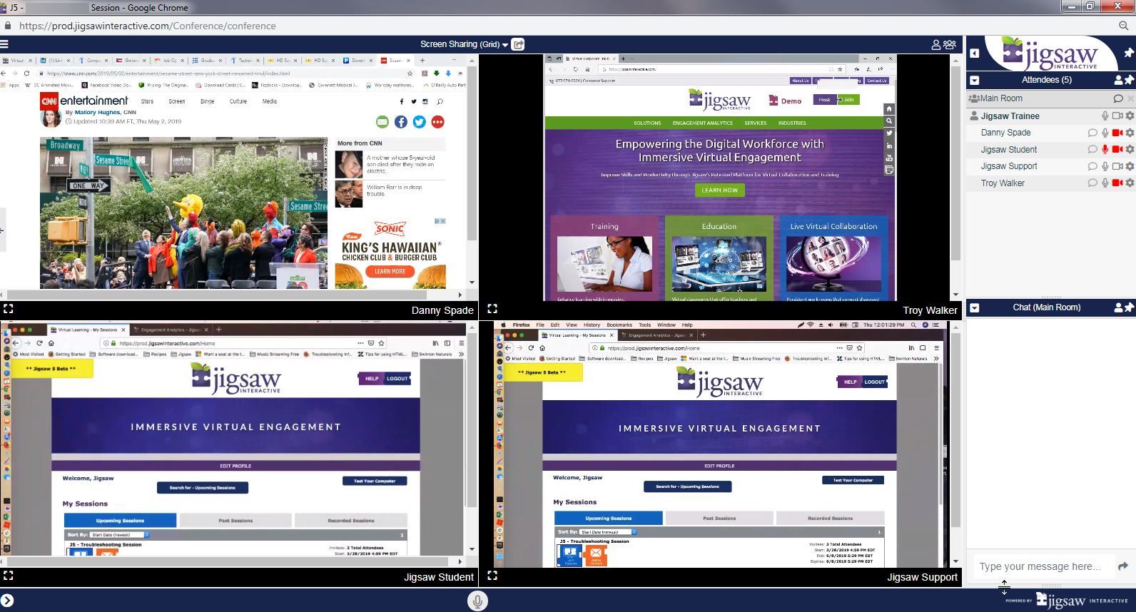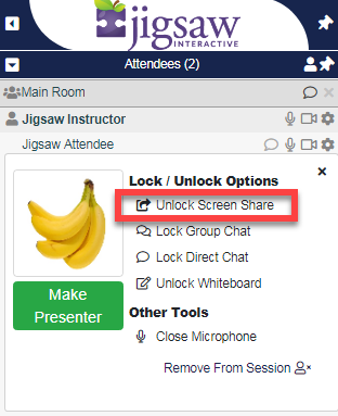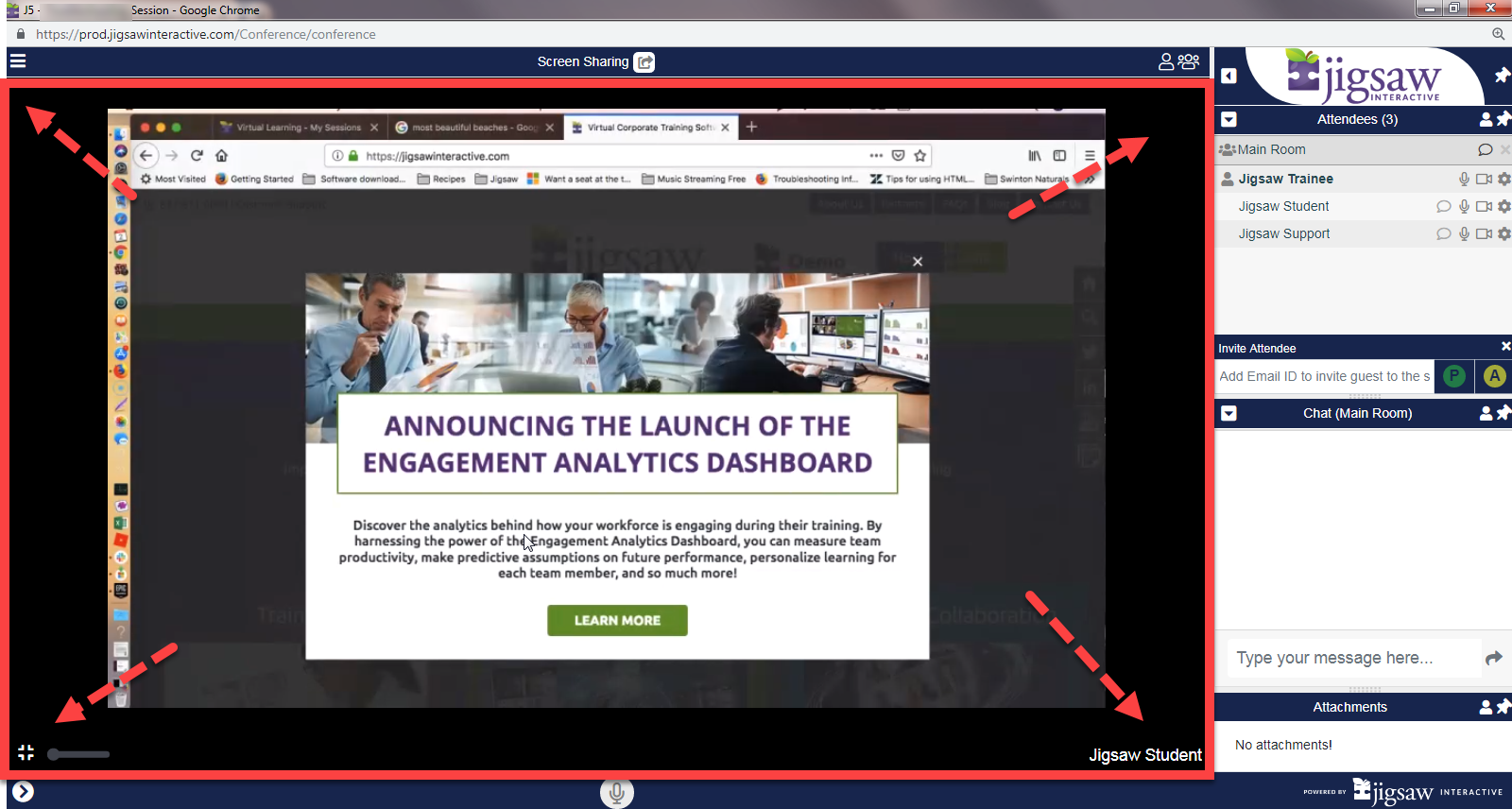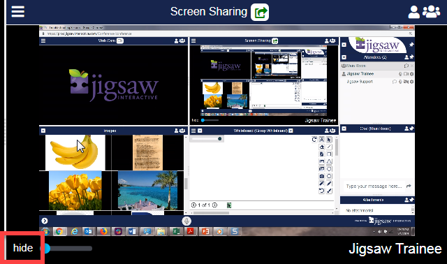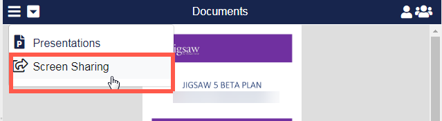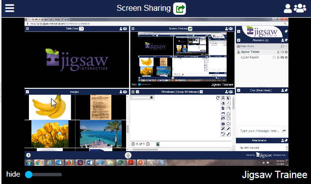 Screen Share is a feature that allows you to share information from your computer with all session attendees. With Jigsaw's Screen Sharing capabilities, you could: