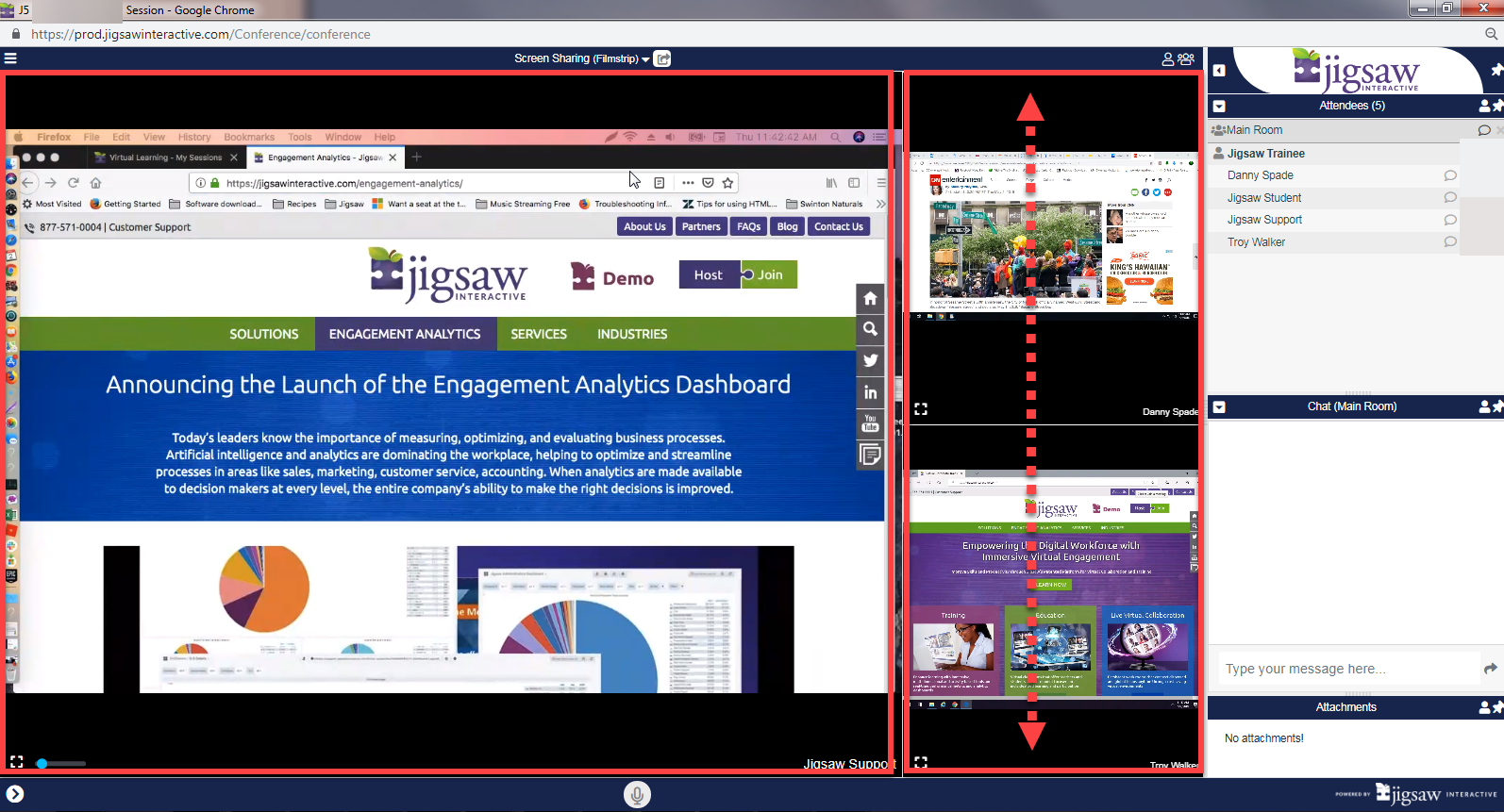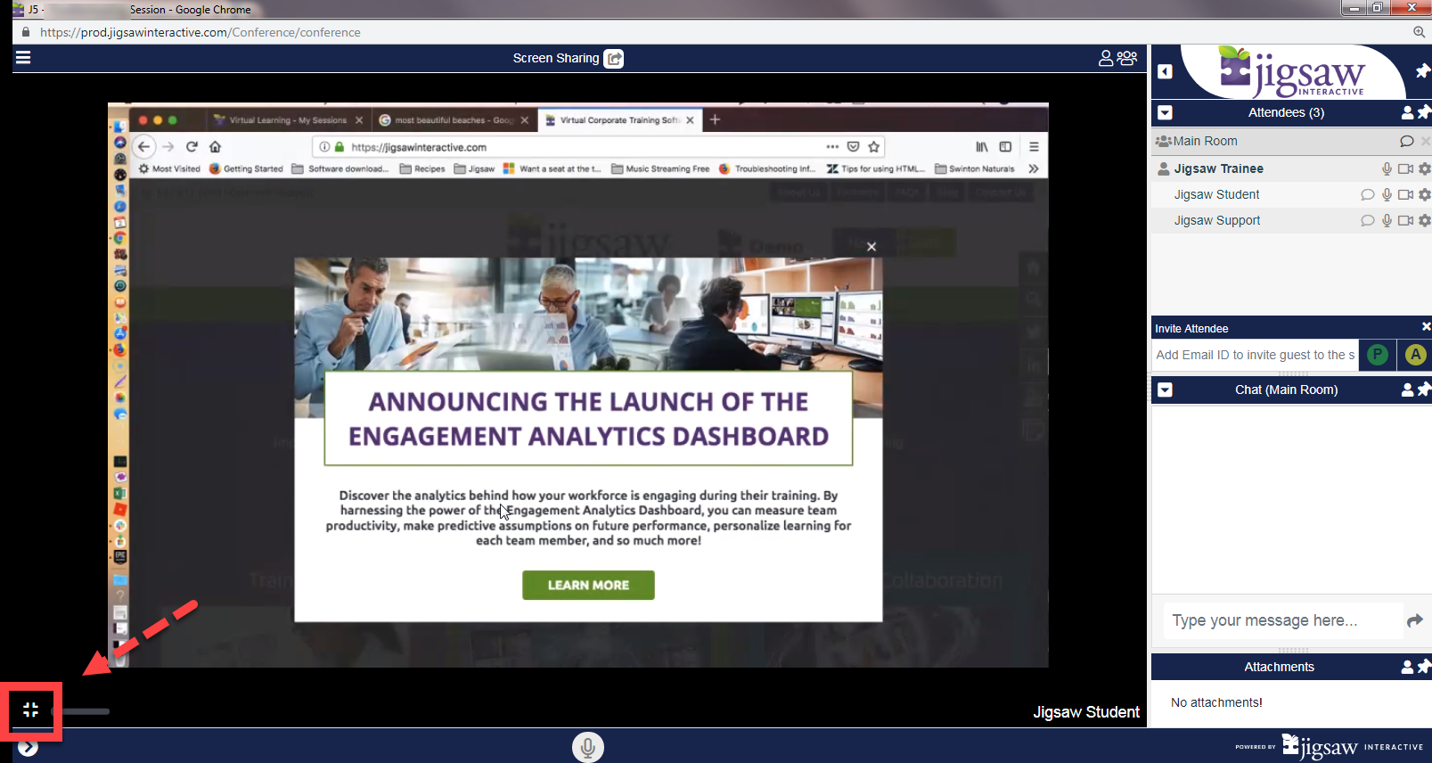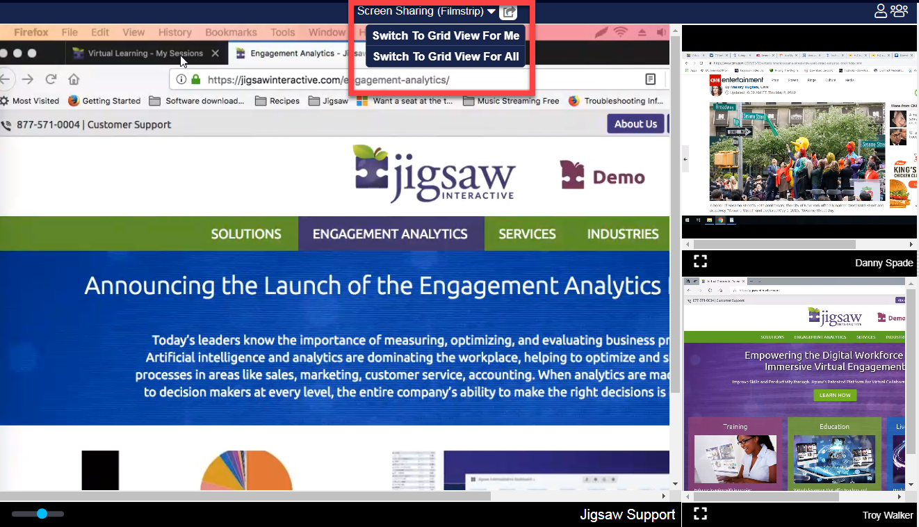 Screen Share is a feature that allows you to share information from your computer with all session attendees. With Jigsaw's Screen Sharing capabilities, you could:
