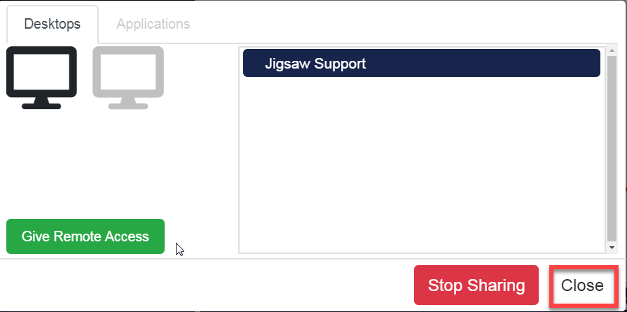 Remote Access is now active. Click "Close" to continue remote access of user's computer.
