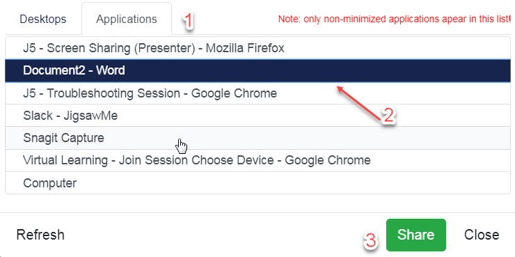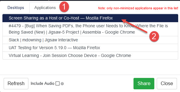 It is possible to screen share in Jigsaw using only the browser (without installing the Jigsaw App). You will not have such functions as Remote Access, Copy/Paste in Pane 2 and Whiteboard, or Insert Screenshot from Pane 2 and Whiteboard. You will have the option to include Audio if using Chrome or Edge.
