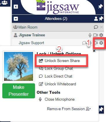 2. In order to invite an attendee to share their screen, the Host or Co-Host must locate that name in the attendee list. Click the gear icon and select "Unlock Screen Share".
