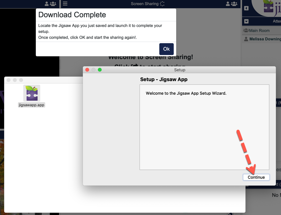 3. Next, click the bullet next Browser Screen Sharing. This will allow you to share without having the Jigsaw App installed. Some tools will not be usable, such as Remote Access and Screen Capturing tools in Pane 2 and Whiteboard. Then click Continue.