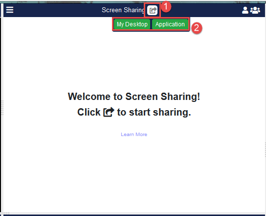 4. Only attendees who have been invited to share their screen will see the white "Screen Sharing" button. They will also see the "Welcome to Screen Share" message. Click "Share" and then follow your browser's prompts for sharing.