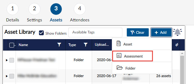 All Assessments can be added when creating/editing a Session. Under #3 Assets the Host/Co-Host: