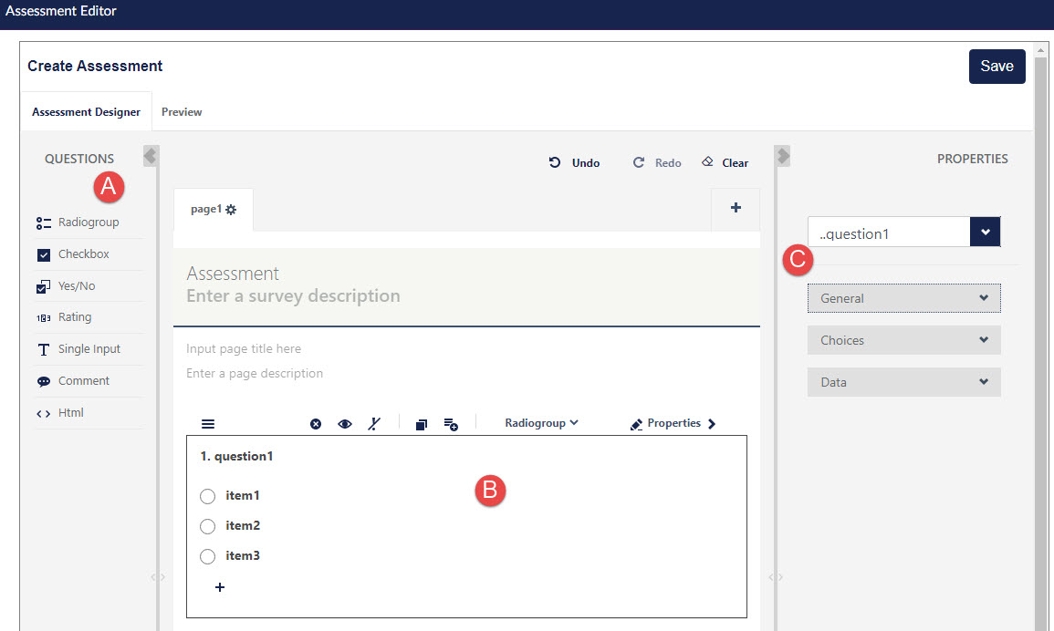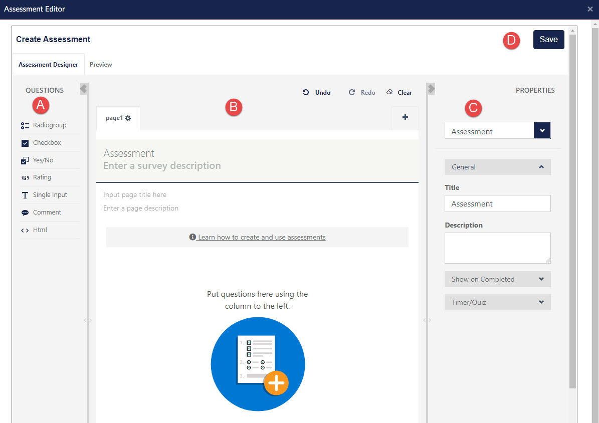 - The Assessment Editor opens (see Assessment Editor for steps on how to build an assessment)
