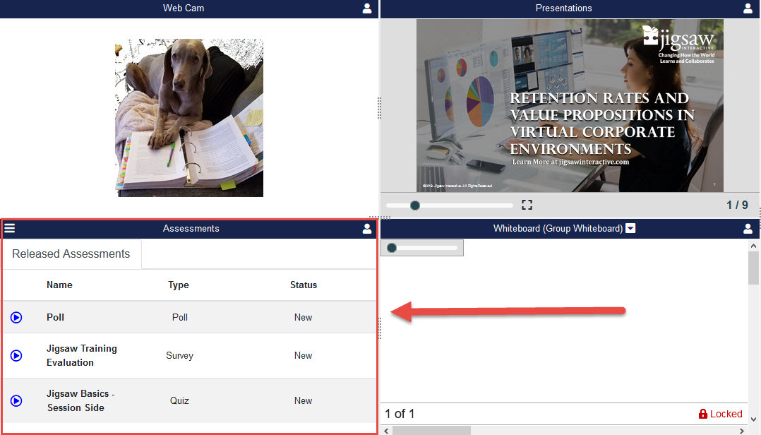 Evaluations, Quizzes, and Surveys are released and launched from Pane 3. The attendees see them under Released Assessments.