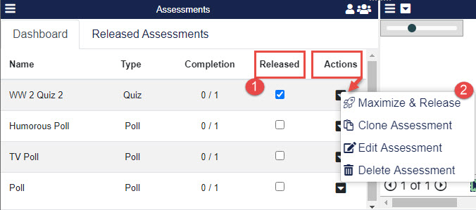 Click the down arrow under Actions and click Maximize & Release for the Assessment to be released. This will cause the Assessment to immediately maximize Pane 3 and open the Assessment for the Attendee to complete.